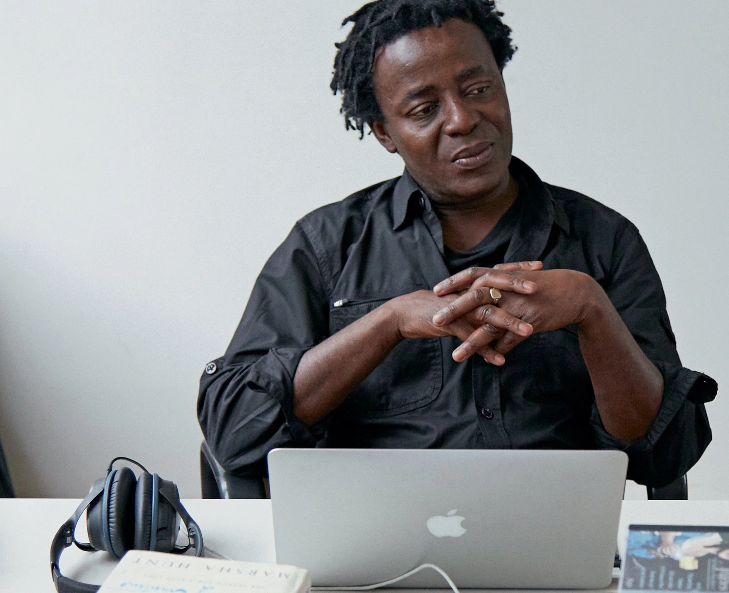 Image Credit: John Akomfrah at his London studio, 2016 © Smoking Dogs Films, Courtesy Smoking Dogs Films, and Lisson Gallery.